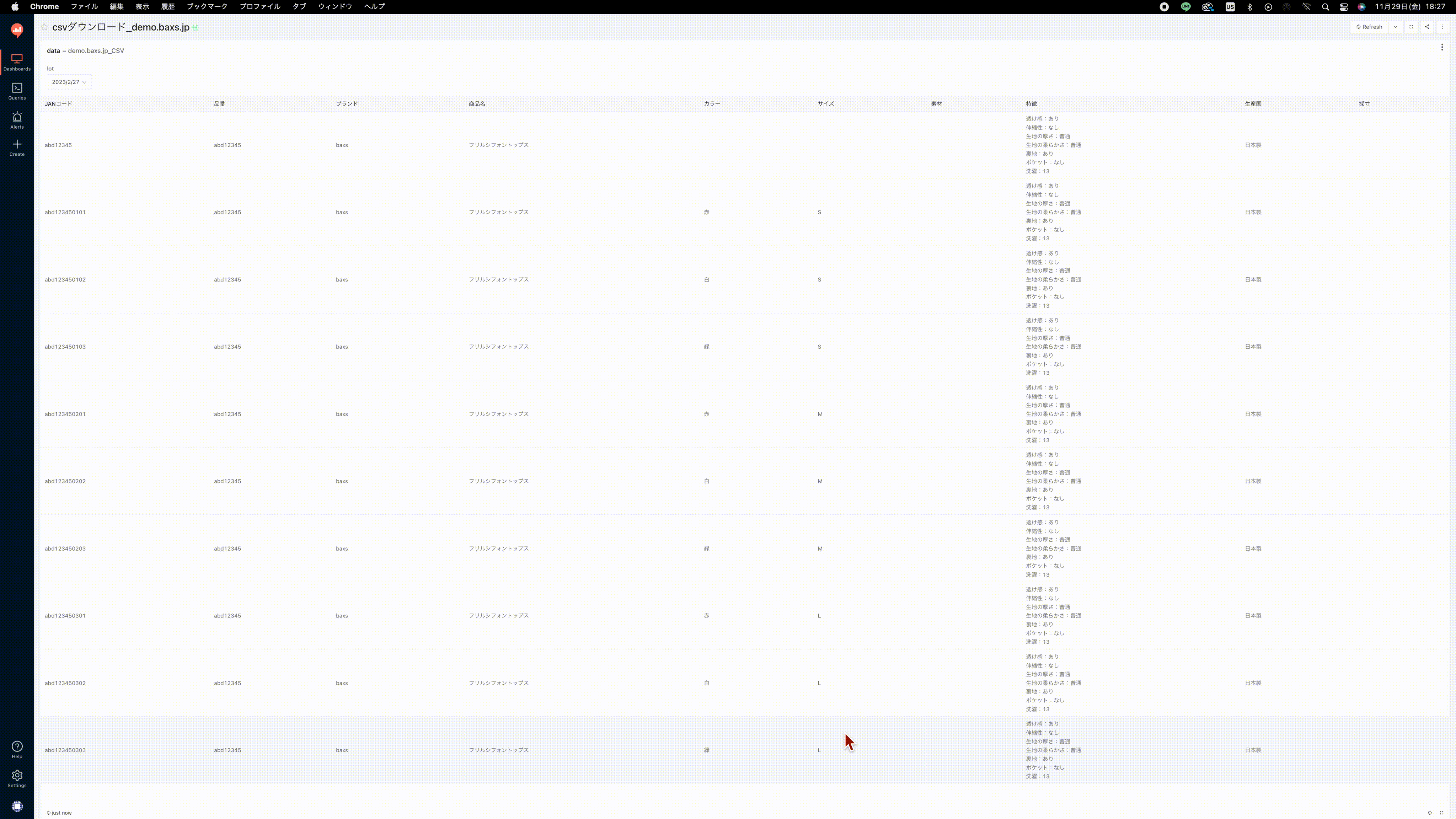 商品情報ダウンロード用ダッシュボードを開く。