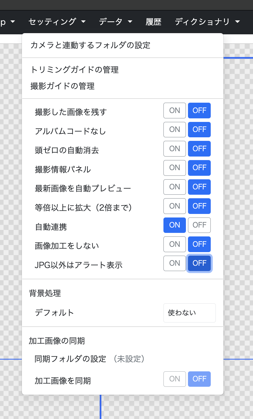 ONにすると、JPG以外の拡張子を持った画像がPANAMAと連動しているフォルダに入っていた場合、〔アップロードボタン〕のクリック時にアラートを表示します。